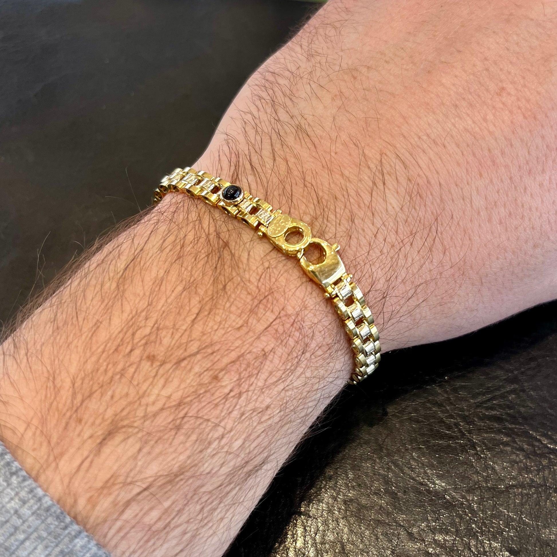 L’alternanza dei due ori crea un contrasto raffinato e contemporaneo, mentre la maglia solida e articolata conferisce al bracciale una presenza importante e un’anima decisamente sportiva. A impreziosire il design, uno zaffiro cabochon incastonato vicino alla chiusura: un dettaglio esclusivo, discreto ma riconoscibile, che aggiunge un tocco di colore e lusso autentico.