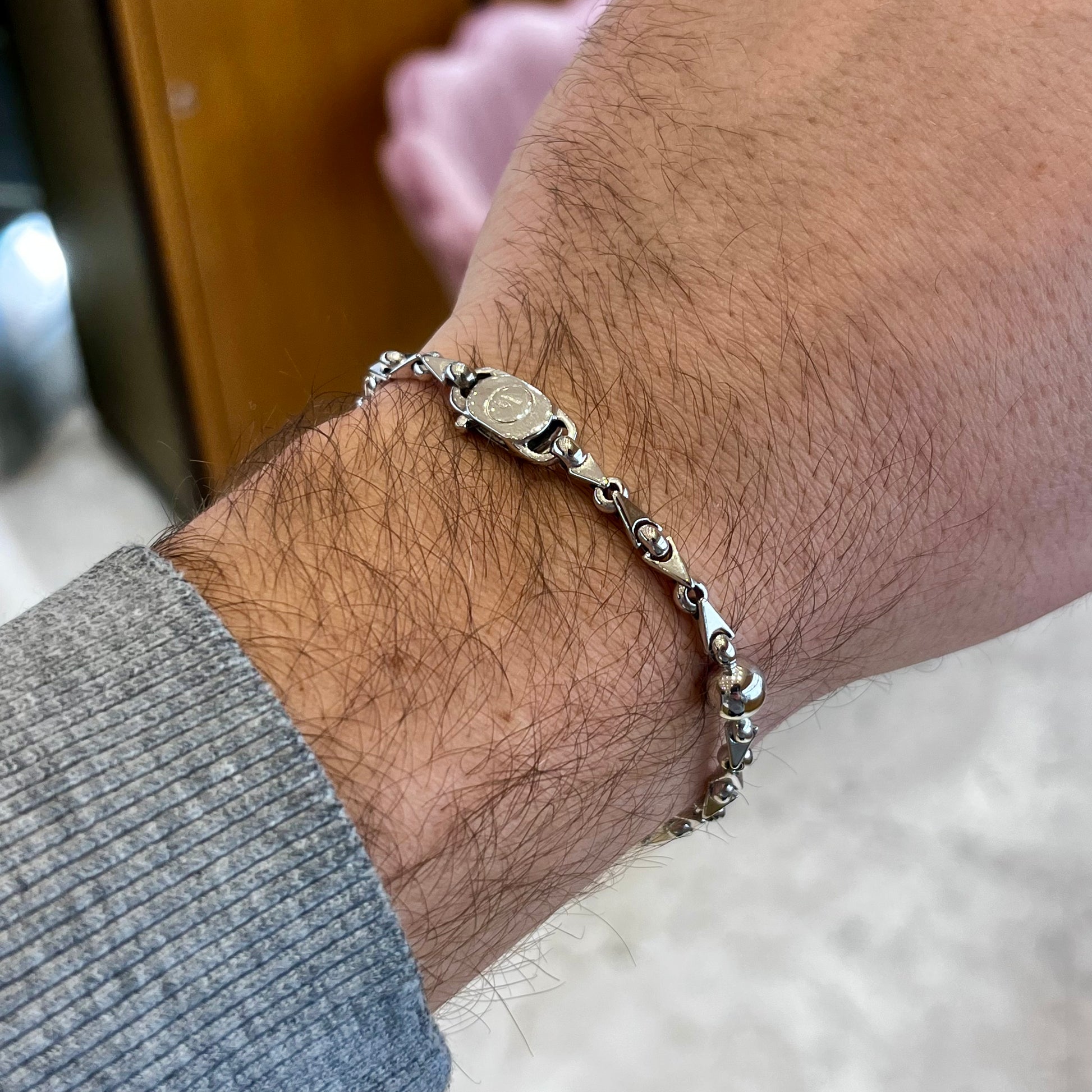 Le forme geometriche creano un ritmo visivo forte e ordinato, esaltato dalla luminosità fredda dell’oro bianco. La costruzione consistente e robusta conferisce al bracciale una presenza significativa al polso, trasmettendo immediatamente una sensazione di qualità, solidità e valore reale.
