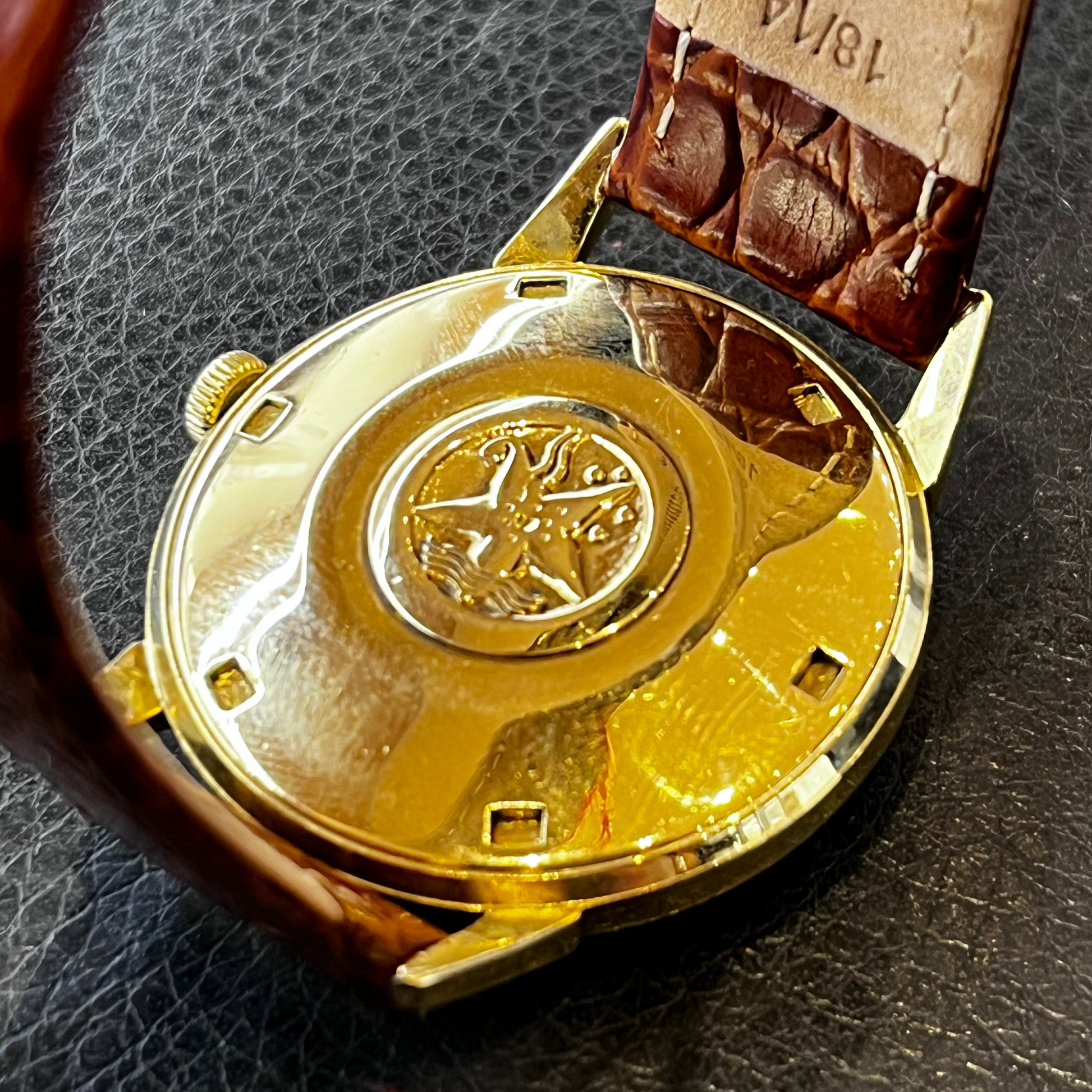 Elegante orologio da polso Eberhard, appartenente alla famiglia dei modelli comunemente identificati come “Gold Ring”, caratterizzati dalla cassa in oro 18kt e dal design classico tipico della produzione Eberhard degli anni ’60-’70. Un segnatempo raffinato, pensato come orologio da abito, con linee pulite e proporzioni equilibrate.